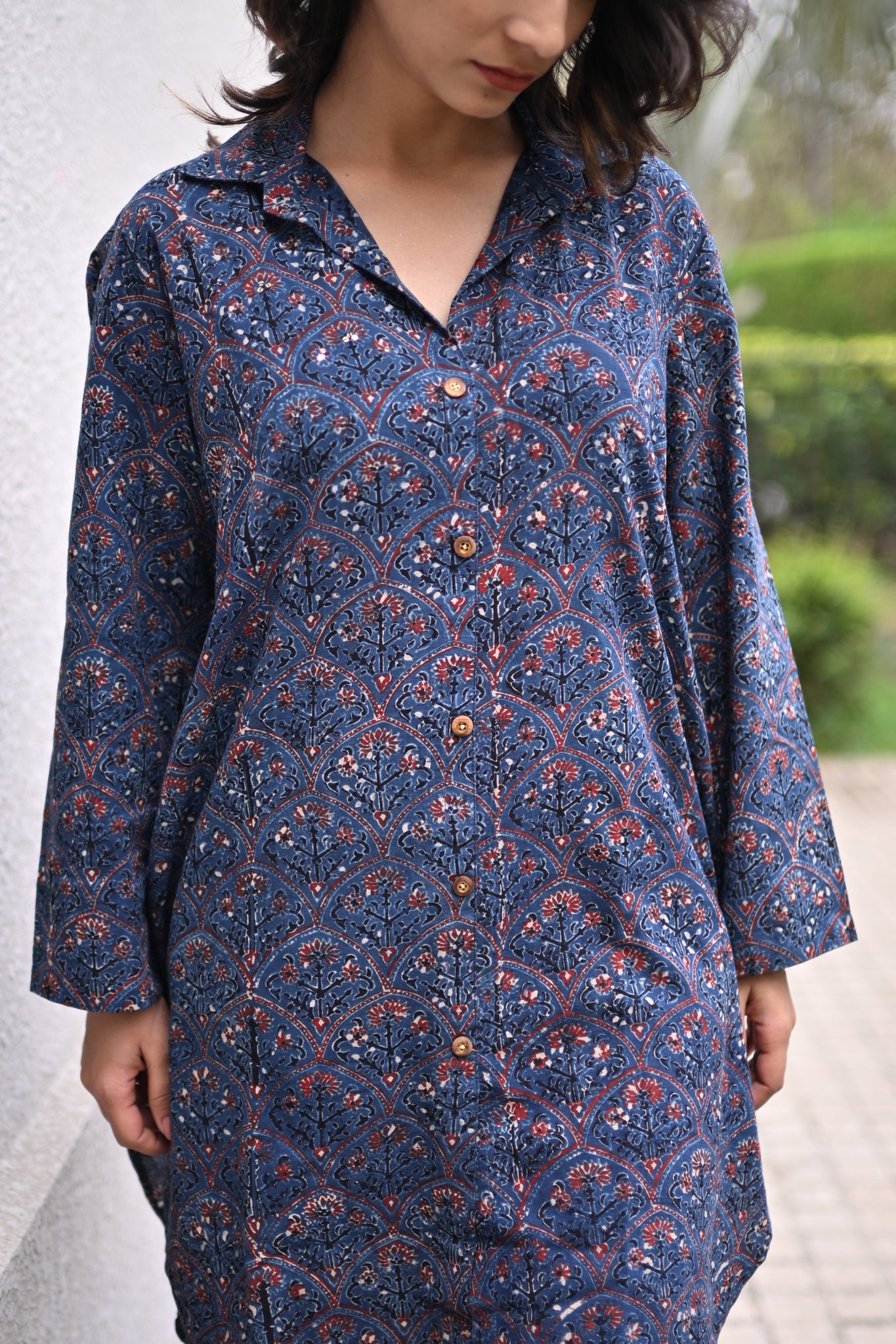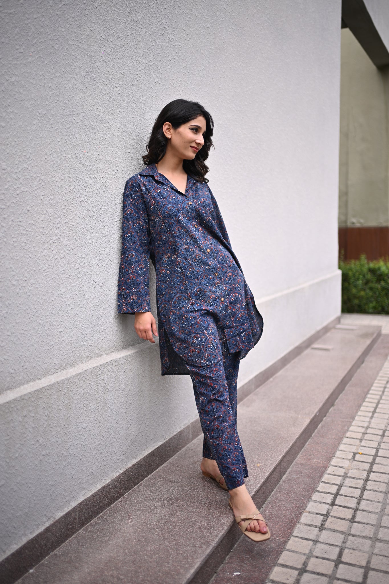 Blue floral ajrakh hand-block collar Vneck kurta features side pockets, pleated back and a straight u shape hemline. Paired with the bottom that comes with an elastic waistband and pockets for a comfortable fit. Very effortless silhouette and perfect pick for your 9 to 9 schedule from office/ meetings /brunches/ evening outings/ dinners.