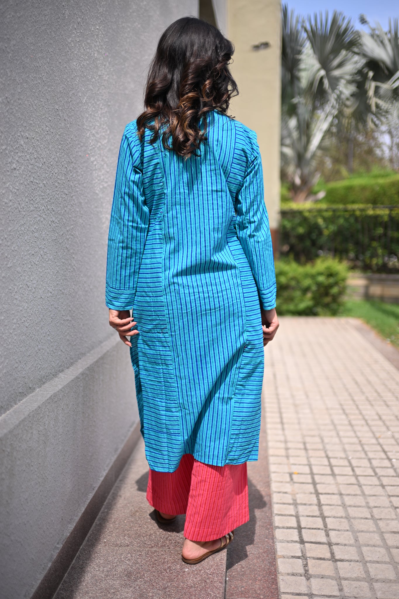 Blue striped hand-block round neck kurta features straight hemline. Paired with a pink striped bottom that comes with an elastic waistband for a comfortable fit. Very effortless silhouette and perfect pick for your 9 to 9 schedule from office/ meetings /brunches/ evening outings/ dinners.
