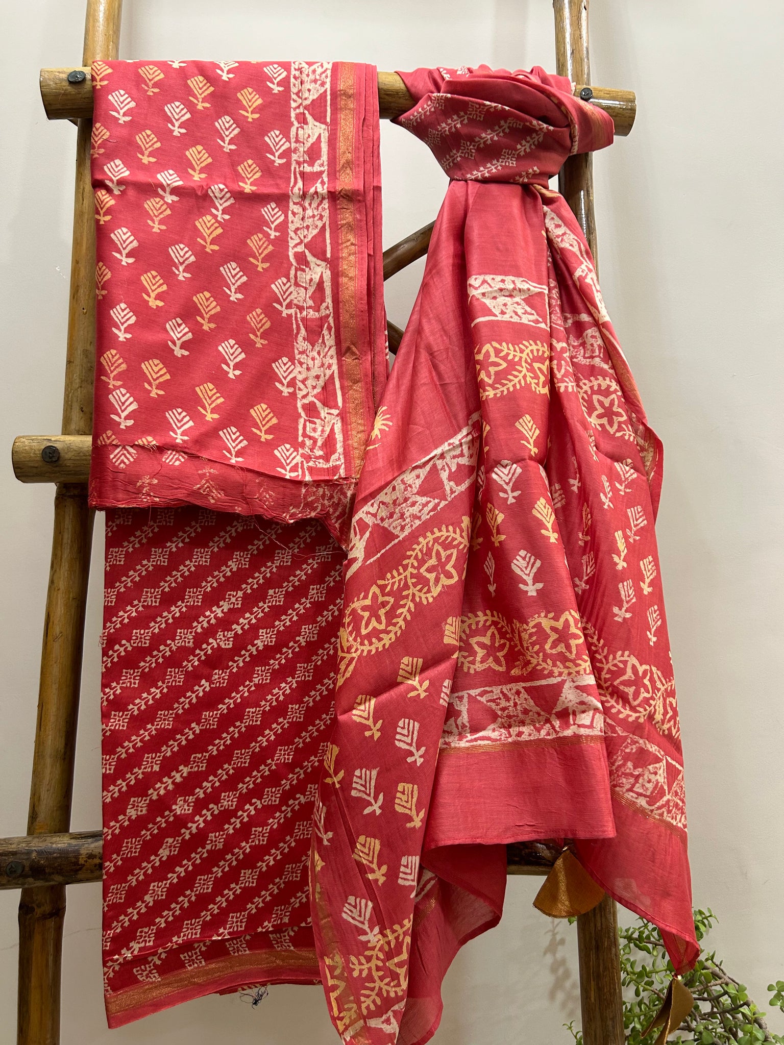 The Handloom Maheshwari silk kurta set is paired with a bottom and dupatta. The soft and lustrous kurta set comes in vivacious coral red and features floral hand-block print detail all over it.