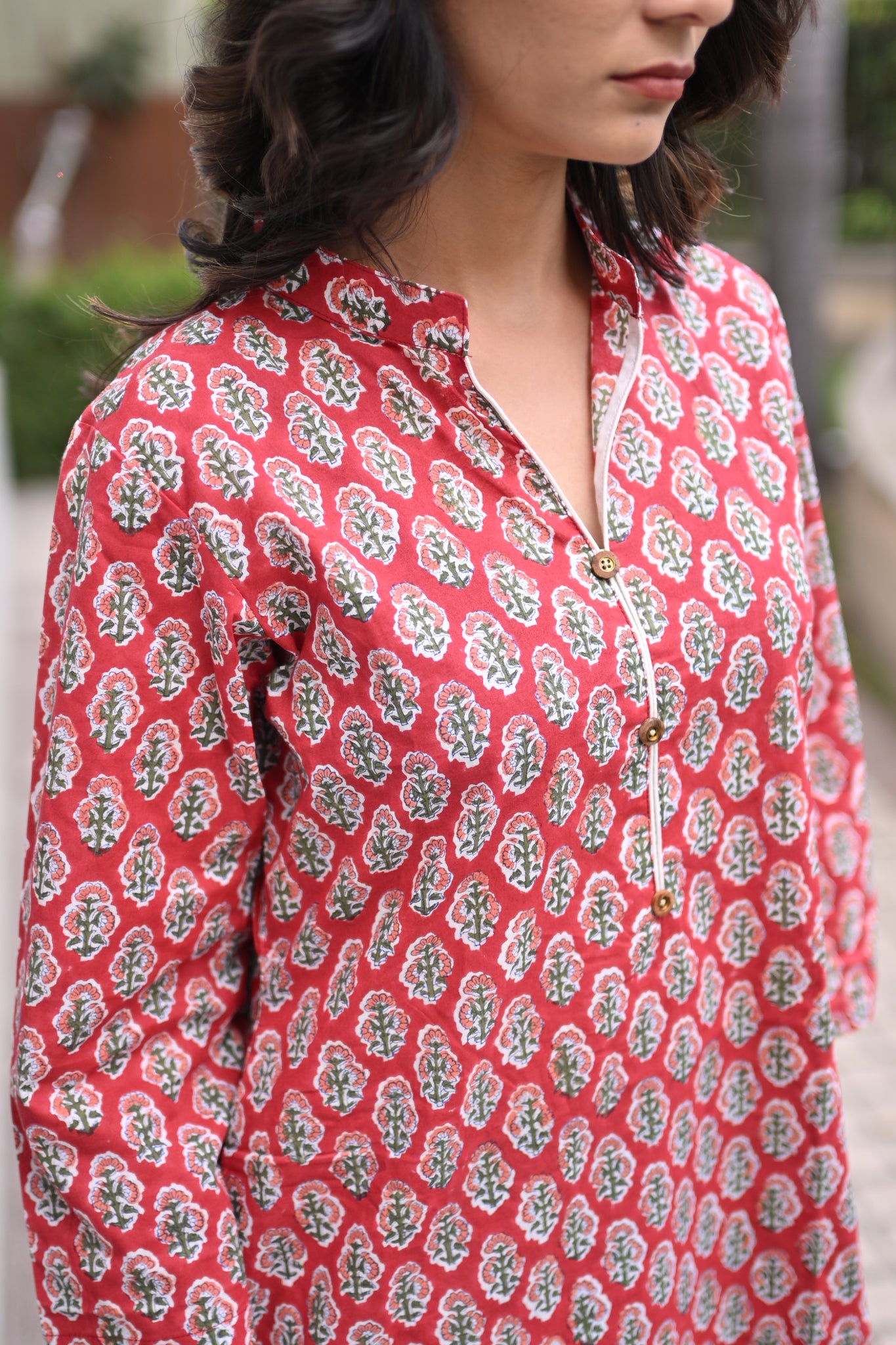 Red floral hand-block collar style kurta features side pockets and a straight hemline. Very comfortable silhouette and fit for your 9 to 9 schedule from office/ meetings /brunches/ evening outings/ dinners.